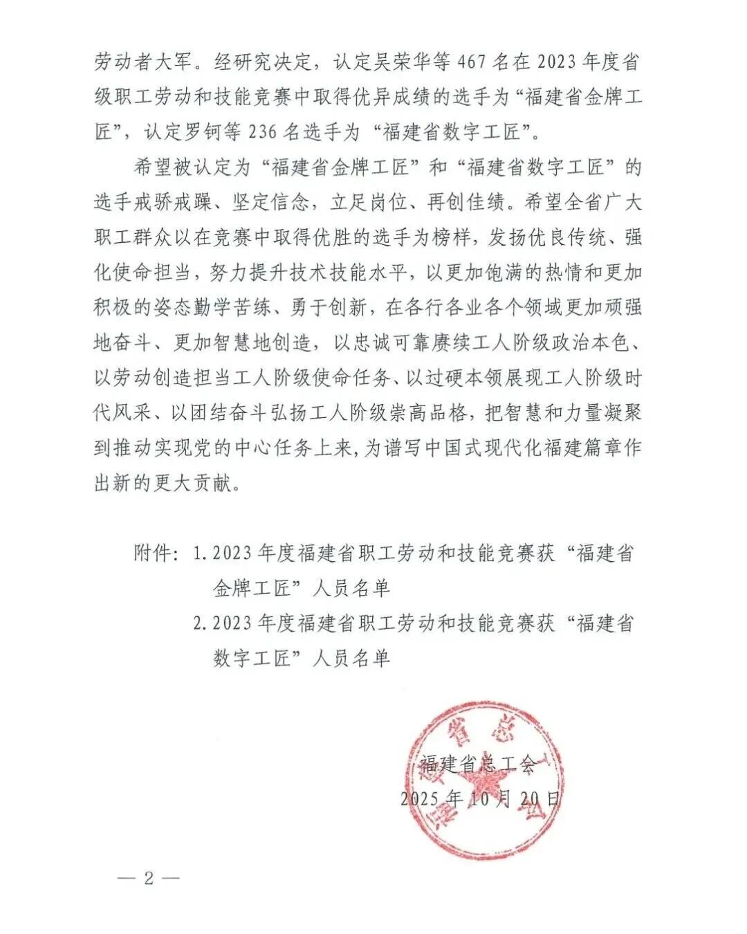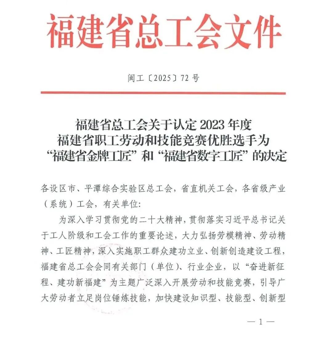 近日,福建省总工会表彰了一批2023年度全省职工劳动和技能竞赛优胜选手,帝一盏黄少屏老师凭借精湛的建安盏烧制技艺水平,荣获“福建省金牌工匠”认定。福建省总工会文件如下: