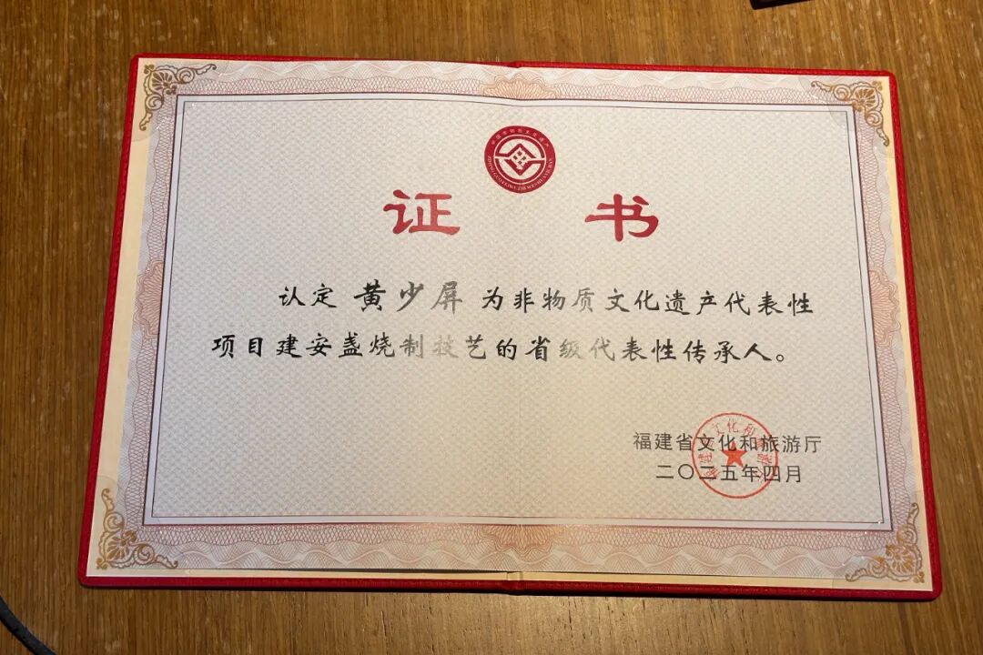 黄少屏老师荣获“非物质文化遗产代表性项目建安盏烧制技艺的省级代表性传承人”认定,获颁证书。这无疑是对匠人技艺水准和传承贡献的高度认可,也是对非遗保护工作可持续发展的重要推动。